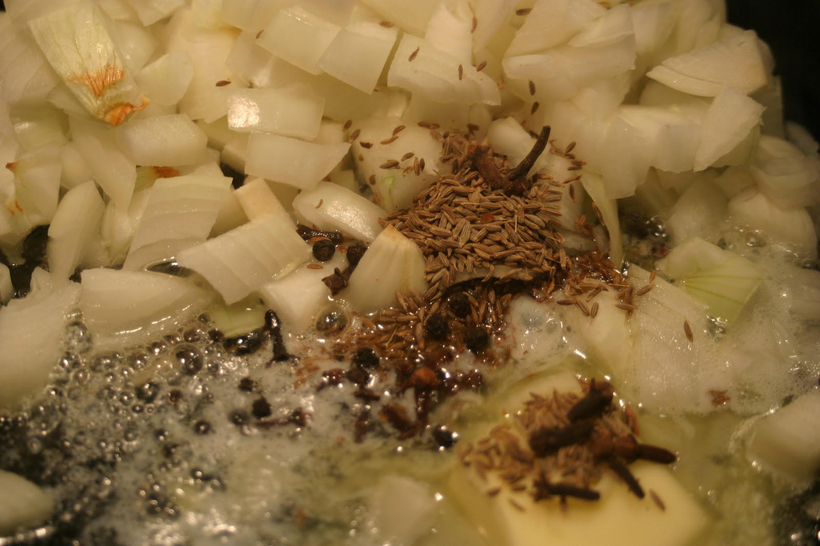 1 large onion, thinly sliced lengthwise (I was distracted and chopped it this time - just has a different look)
