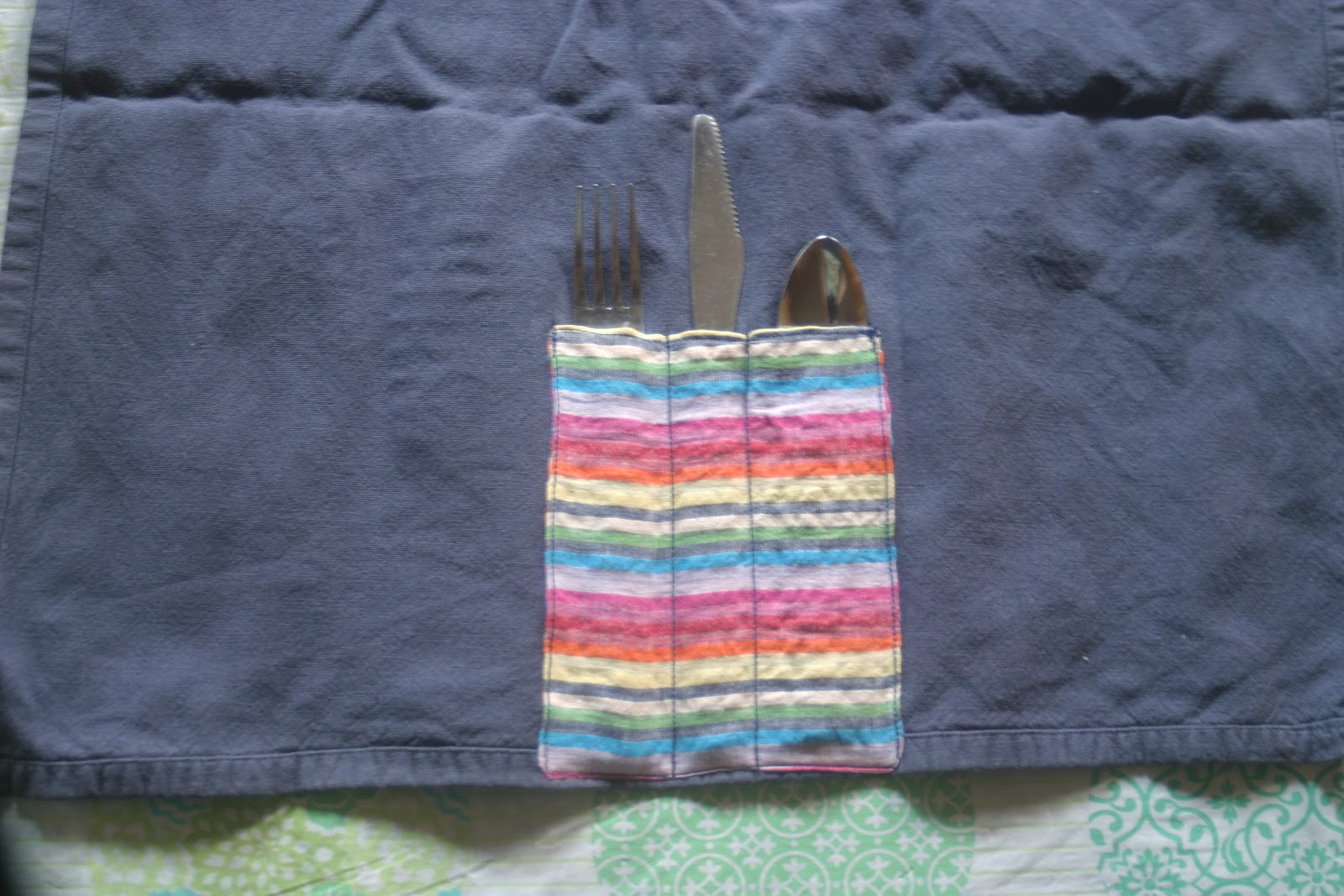 those four cloth napkins I bought for no good reason and stitched bright pockets on them. The pockets are thin enough so the napkin is still useful as a napkin, but secure enough so the silverware stays tucked in there for the ride. I fold the top of the napkin down over the pocket and roll it up.
