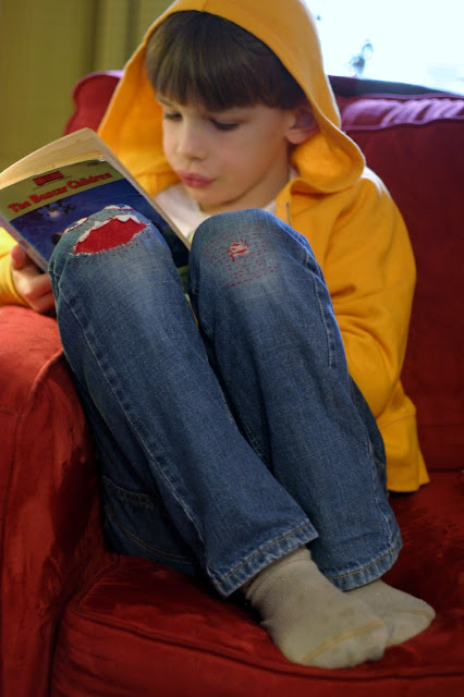 "Boro" is Japanese mending using a field of sashiko (embroidery) stitches. Boro is quite trendy on Pinterest right now, but I just eyeballed it when Ben's other knee, next to the monster, wore through.