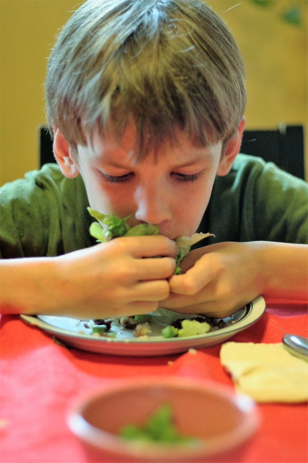 I pretended this was a Korean sloppy joe:  rich salty beef  in lettuce cups.  The lettuce I had on hand wasn't very cup-like, so combine that with Ben's rather caveman-like manners and that's why I picked up my camera.