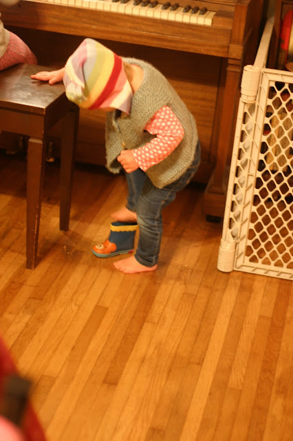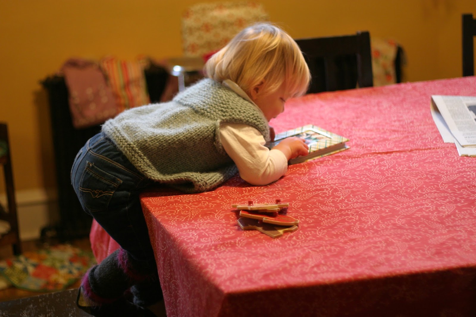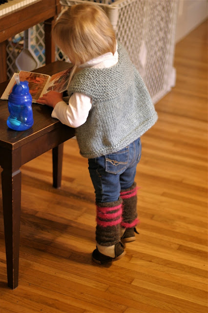Phoebe is very interested in dressing and undressing these days. Sometimes she tugs on the vest, trying to get it off and on, and it has stretched out a bit because of that. Thank goodness it wasn't a terribly complicated pattern with fancy yarn!