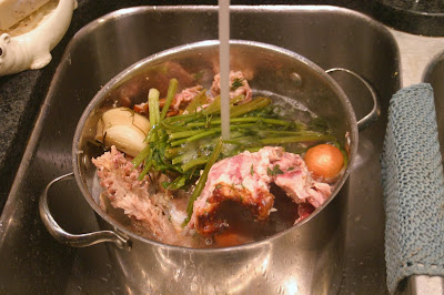I asked for, and got, the two turkey carcasses from our extended family Thanksgiving today. Thanks, Aunt Elena! After the long drive home, I fixed them up for their long simmer into stock.